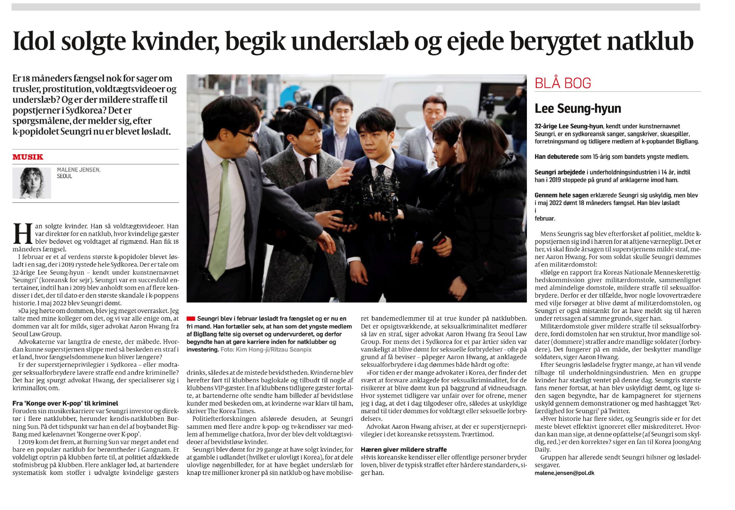 Attorney Aaron Hwang of Seoul Law Group was recently featured in a Politiken article discussing the high-profile sexual offense case involving K-pop idol Seungri. Offering a critical legal perspective, Hwang expressed surprise at Seungri’s 18-month prison sentence, calling it “far too mild” and raising questions about whether sex offenders in Korea are receiving lenient treatment.